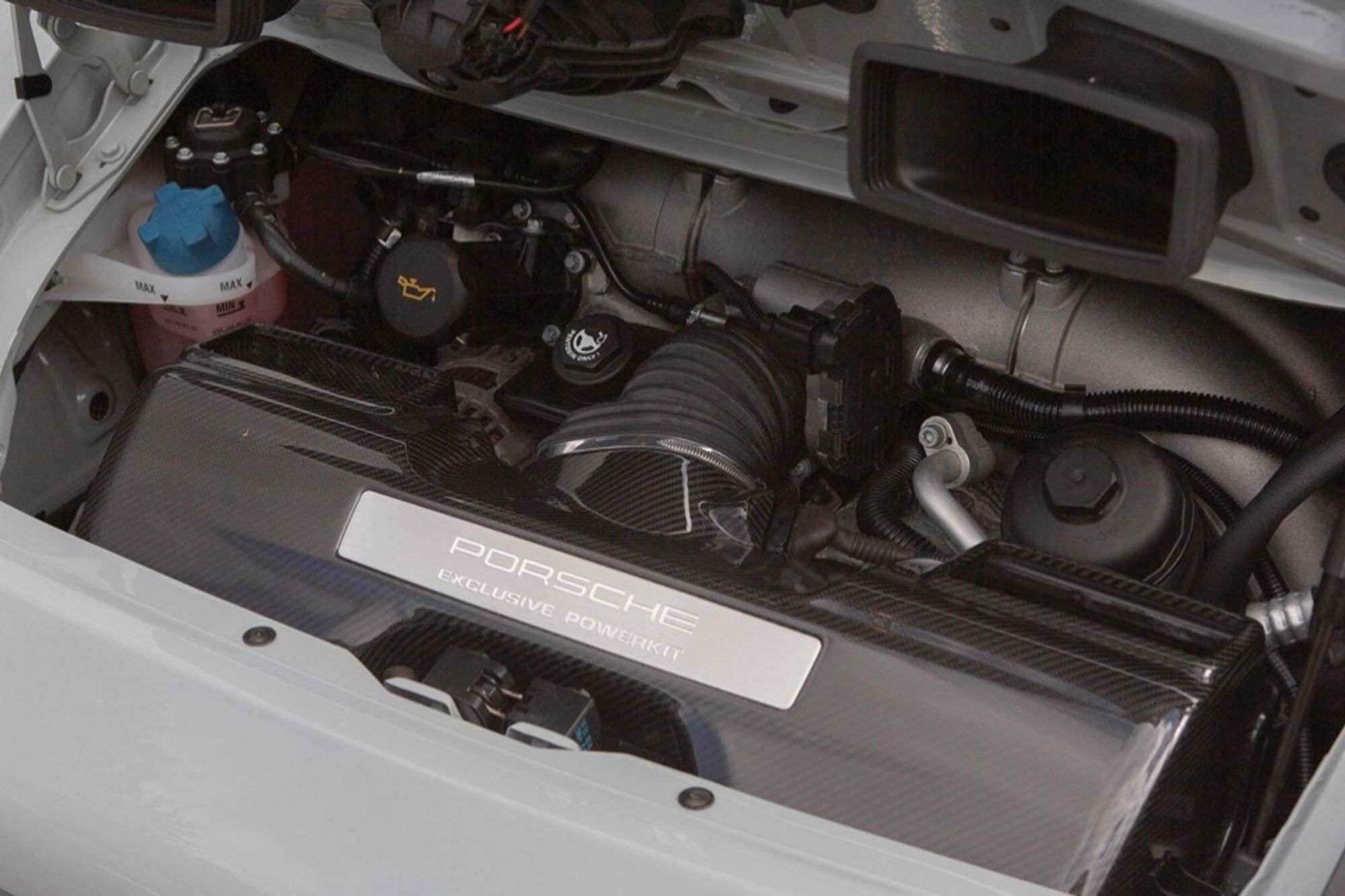 The fascinating roof contour, which Porsche called “Double-dome,” is reminiscent of the “double bubble” roofs seen on the designs of Zagato. The body shell includes wider (by 1.75 in.) rear quarter panels borrowed from the Carrera 4 to accommodate the wider track, along with revised rocker sills and rear bumper. The 19-in. alloy wheels are custom-made and resemble the iconic rims made by Fuchs. The front fascia was created by SportDesign and offers a unique front spoiler lip, while the engine cover hosts a rear “ducktail” spoiler harkening to the classic Carrera RS of 1973. The door skins are light aluminum alloy for a bit of weight-saving. All Sport Classic coupes were painted an unusual color called Sport Classic Grey with a pair of medium gray stripes runs the length of the hood, roof, and tail.